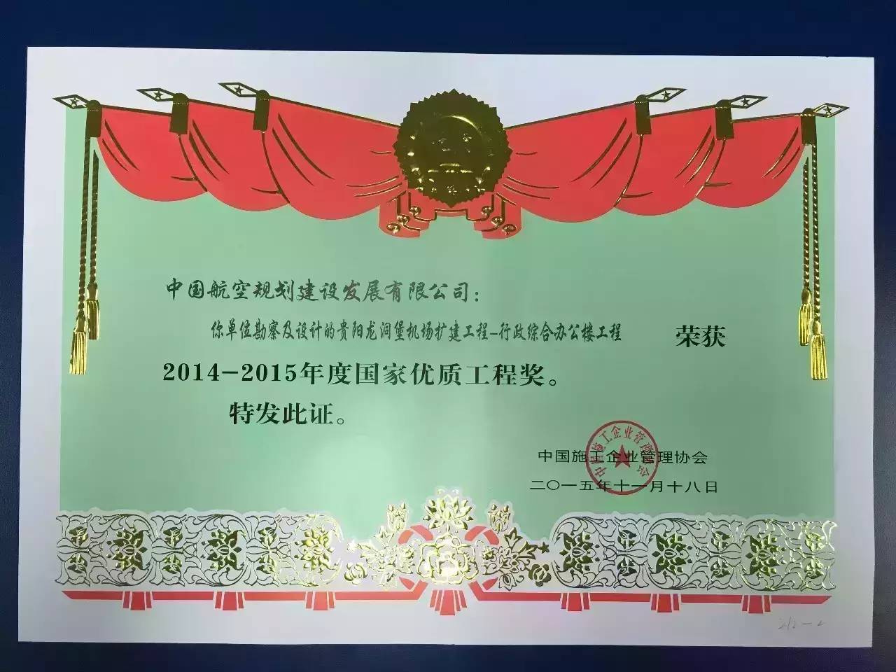 龍洞堡國際機場擴建工程行政綜合辦公樓項目榮獲“國家優質工程獎”