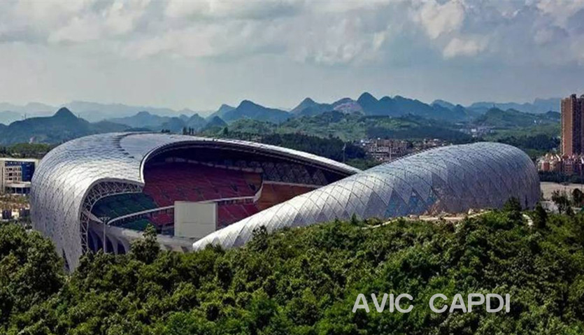 Traits caractéristiques: le Centre du sport olympique de Guiyang possède 51636 de places, avec 6 étages et le hauteur de la couverture est de 52.25m. La tribune de spectacle est con?ue de fa?on enfermée, dont l'est est construit tout au long de la montagne, et l'ouest se constitue de 6 étages y compris zone de VIP, zone des sportifs, zone de média, salle de gymnastique, et des salles techniques auxiliaire
